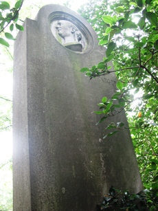 Sa tombe, ornée d’un médaillon en marbre, n’est pas mise en valeur : elle est occultée par la végétation en bordure du bosquet Delille.