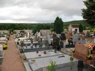 J’ai visité cette tombe il y a bien longtemps et les arbustes l’entourant étaient malingres, et ils soulignaient une sorte de gémellité avec la tombe opposée, celle juste au-dessus. La nature a pris le dessus, ce regroupement n’est plus perceptible. Deux identiques pierres tombales, même granit noir, mêmes dimensions, encadrées de sapins définissant une sorte de continuité des deux sépultures.