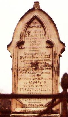 A l’endroit stipulé avoir été le tombeau de FELETZ, c’est-à-dire précisément en 1ère ligne Nord et 17ème tombe Est de la Division 12, se trouve une tombe portant le n° de concession 439 P 1849 (de facture récente, au nom du Général Jacques Guérin dit "Ampère" [1918-1995]). D’un côte comme de l’autre de celle-ci, aucune concession ne date du 19ème siècle. M’étant rendu, avec mon ami Patrick, sur place, et grâce à la "vieille photographie" de votre site qui permet de repérer plusieurs sépultures environnantes, il pourrait bien s’agir de l’emplacement tant recherché. Cependant, la date de la concession (1849), fait obstacle à une affirmation définitive.