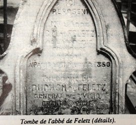 le tombeau de l’académicien et du général de Feletz était encore visible dans les années 1990 et d’un seul bloc, certainement reconstruite après cette photo ; je possède la photo de cette tombe que j’ai prise et je suis né en 1966