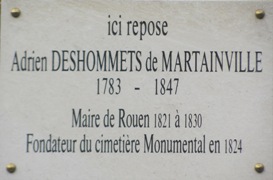– Adrien Charles DESHOMMETS de MARTAINVILLE (1783-1847) : maire de Rouen de 1821 à 1830, il fut député de la Seine-Inférieure de 1824 à 1827. C’est sous son mandat de maire qu’ouvrit le cimetière monumental en 1828. (H1)