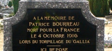 – Une tombe rappelle la mémoire de Patrice Bourreau, mort dans le torpillage du Gallia. Le navire se trouvait entre les côtes de Sardaigne et la Tunisie, lorsqu’une torpille lancée par un sous-marin allemand vint le toucher par le travers de la cale avant, chargée de munitions. L’explosion fut considérable et le Gallia coula en moins de quinze minutes.