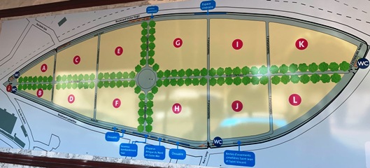Bourgeois et conformiste dans ses parties anciennes, le cimetière ne possède pas de monuments particulièrement extravagants, de ceux qui plaisent au promeneur en visite. Plat et peu arboré au sein de ses divisions, d’un relief et d’un profil monotone, l’endroit ne se distingue que par sa forme singulière qui se dessine dans le paysage urbain ; celle d’un grand navire vu de haut (d’une baleine ? D’un poisson ?) bordé par avenues et lignes de chemin de fer.