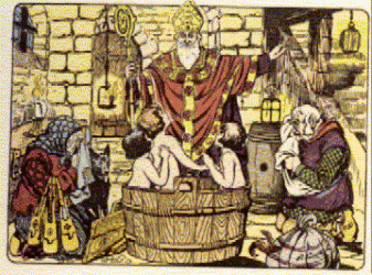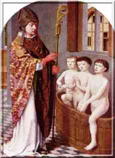 Bien que destinée aux enfants et à l’instar de tant de contes et de comptines, la plus connue des légendes de Saint-Nicolas est plutôt effrayante : "Ils étaient trois petits enfants qui, s’en allaient glaner aux champs", comme dit la chanson... Perdus, ils demandèrent l’hospitalité chez un boucher qui ne trouva rien de mieux que de les tuer, les découper et les mettre au saloir. Saint-Nicolas vint à passer sept ans plus tard et demanda à son tour l’hospitalité. Il insista pour manger le petit salé préparé sept ans plus tôt. Le boucher s’enfuit et Saint-Nicolas ressuscita les trois enfants.