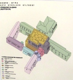 La première église Saint-Nicolas de Myre remonte au VIe siècle. L’édifice actuel fut construit essentiellement au VIIIe siècle. Un monastère vint s’ajouter au milieu du XIe siècle. En 1863, le tsar Alexandre II de Russie acheta le bâtiment et entama une restauration. En 1963, on dégagea les ailes Est et Sud. En 1968, la tombe de saint Nicolas fut couverte d’une toiture. Le sol de l’église est réalisé enune mosaïque de marbre coloré, et des fresques subsistent sur les murs, parmi lesquelles de magnifiques scènes de conciles, mais également tout un cycle de la vie de Saint Nicolas dans la chambre funéraire.