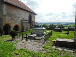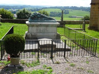 beau tombeau de Pierre-Claude PAJOL (Pierre-Claude Pajot : 1772-1844). Après avoir combattu à Valmy et au siège de Mayence, il devint aide-de-camp de Kléber et gravit les échelons d’officier dans les armées napoléoniennes jusqu’à devenir général, baron puis comte d’Empire. Il s’illustra particulièrement en 1814 à la bataille de Montereau où il fut blessé. Fait Pair de France et gouverneur de Paris par Louis-Philippe, il mourut des suites d’une chute dans les escaliers des Tuileries. Il fut inhumé au Père Lachaise avec son épouse, une fille du Maréchal Oudinot, puis fut transféré à Nozeroy d’où il était originaire. La statue le représentant gisant en uniforme fut réalisée en 1878 par son fils, le général mais également sculpteur Charles Pierre Victor Pajol. Par sa mère, il était le cousin germain de l’académicien et écrivain romancier Charles Nodier.