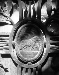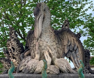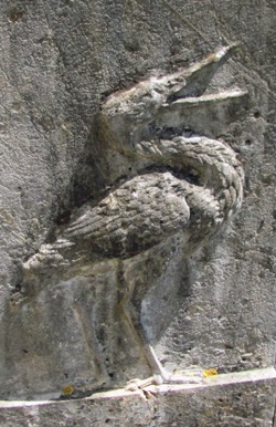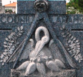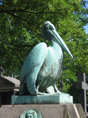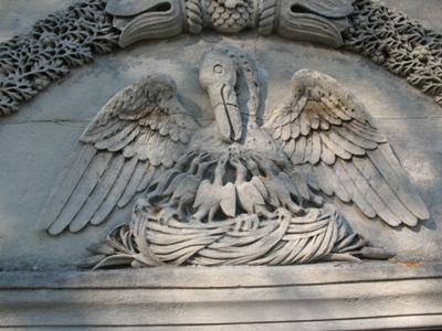 Le pélican est un animal qui possède la particularité de nourrir ses petits en leur laissant prélever, après l’avoir régurgitée, la pêche préalablement emmagasinée dans une poche membraneuse située sous sa mandibule inférieure. C’est probablement à partir d’un malentendu qu’est née la fable du pélican se transperçant le poitrail pour nourrir ses petits de son propre sang, et c’est en raison de cette fable que l’iconographie chrétienne s’est emparée de l’oiseau pour en faire un symbole de la Passion subie par le Christ pour le rachat de l’humanité.