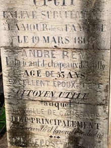 Epitaphe insolite sur la tombe d’André Rey : "Ci git enlevé subitement à l’amour de sa famille le 19 mars 186 ? André Rey, fabricant de chapeau de pailles âgé de 53 ans. Excellent époux et père, citoyen utile auquel la ville de Caussade doit principalement une nouvelle et favorable industrie".