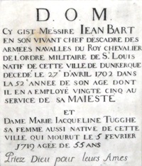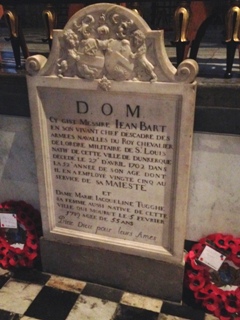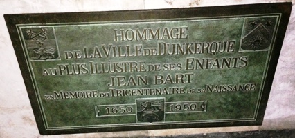 C’est dans cette église que repose la grande figure de Dunkerque, le corsaire Jean BART (1650-1702), qui s’illustra durant les guerres de Louis XIV. Il commença à naviguer à quinze ans et participa en 1667 au raid hollandais sur la Tamise. Pendant la guerre de Hollande, il fut corsaire pour le compte de la France et accumula les prises (plus de cinquante entre 1674 et 1678). Admis dans la Marine royale avec le grade de lieutenant de vaisseau en 1679, il croisa en Méditerranée contre les Barbaresques et fut promu capitaine de frégate en 1686. En 1689, il fut fait prisonnier par les Anglais, s’évada et revint à Saint-Malo en traversant la Manche à la rame. Promu capitaine de vaisseau la même année, il mit au point une tactique de guerre fondée sur l’utilisation de divisions de frégates rapides et maniables, sorte de « préfiguration des meutes de sous-marins de la Seconde Guerre mondiale ». En 1690, il commanda L’Alcyon à la bataille du cap Béveziers, puis il escorta les convois en mer du Nord après avoir brisé le blocus imposé à Dunkerque. Son exploit, sans doute le plus célèbre, qui lui valut des lettres de noblesse, fut la reprise sur les Hollandais devant le Texel d’un énorme convoi de cent-dix navires chargés de blé que la France avait acheté à la Norvège. En 1696, il livra sur le Dogger Bank un violent combat à une escadre hollandaise, détruisant plus de 80 navires, et rentra à Dunkerque en déjouant la surveillance anglaise. Promu chef d’escadre en 1697, il conduit le prince de Conti en Pologne, puis commanda la marine à Dunkerque.