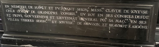 Elle contient le mausolée de Claude de Joyeuse, comte de Grandpré (+1629), et de son épouse. Il avait été capitaine au sein des Ordonnances du Roi, conseiller des rois Henri IV et Louis XIII, gouverneur de Mouzon et de Beaumont en Argonne. Il avait abjuré sa religion protestante. Le tombeau en marbre noir est placé sous un dais soutenu par quatre colonnes ioniques. Des statues, mutilées pendant la Révolution française, sont disposées sur la table supérieure, aux angles de l’entablement, et représentent la fidélité, la foi, la tempérance et le courage. Les statues de marbre blanc représentant Claude de Joyeuse et sa femme ont été brisées lors des événements révolutionnaires. On peut lire sur le mausolée : Tout ce que la terre nourrit - Finalement elle le pourrit.