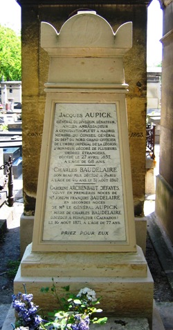 Il fut inhumé auprès de son beau-père qu’il détestait tant : l’officier Jacques Aupick (1789-1857). Dans ce même cimetière, le sculpteur Jose de Charmoy a réalisé en 1902 un cénotaphe dédié au poète (il se trouve entre la 26ème et la 27ème division) : il représente, au sol, un gisant entouré de bandelettes surmonté d’un buste du poète grimaçant et méditatif à la fois, placé sur le haut d’une colonne sur laquelle s’accroche une chauve-souris. Certains visiteurs prennent ce cénotaphe pour la tombe de Baudelaire.