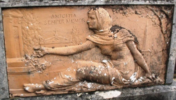 – Proche de l’entrée du cimetière, une tombe est ornée d’une très belle terre-cuite signée Justin Chrysostome Sanson.