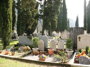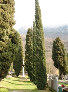 Dans la banlieue proche de Grenoble, le magnifique petit cimetière de Fontanil-Cornillon est une pelouse ombragée par les cyprès sur lesquelles les stèles forment un ensemble harmonieux.