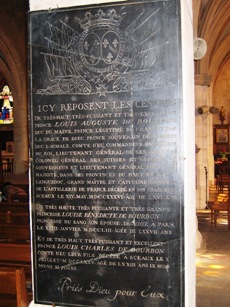 "Ici reposent les cendres de très haut, très puissant et très excellent prince Louis Auguste de Bourbon, duc du Maine, prince légitimé de France, par la grâce de Dieu, prince souverain de Dombes, duc d’Aumale, comte d’Eu, commandeur des ordres du roi, lieutenant général de ses armées, colonel général des Suisses et Grisons, gouverneur et lieutenant général pour sa majesté, dans ses provinces du haut et bas languedoc, grand maître et capitaine général de l’artillerie de France. Décédé en son château de Sceaux le XIV mai MDCCXXXVI (1736), âgé de LXVI (66 ans)