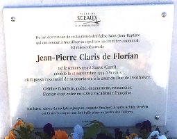 Jean-Pierre CLARIS de FLORIAN (1755-1794). Ecrivain français, petit-neveu de Voltaire par alliance, il se fit connaître par ses fables. Il fut élu à l’Académie française en 1788. Soupçonné pour ses relations avec l’Ancien Régime lors de la Révolution française, il se réfugia à Sceaux. Il fut arrêté en 1794. Remis en liberté le 27 juillet, il mourut peu après, à l’âge de trente-neuf ans, des suites de sa détention.
