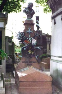 Ce compositeur inclassable, créateur de l’Opéra bouffe, dut batailler pour prendre place dans le milieu musical de son époque : c’est parce que ses origines juives et allemandes lui avaient fermé un grand nombre de portes qu’il dut imposer un style nouveau. Son association avec les librettistes Henri Meilhac et Ludovic Halevy (inhumés également dans ce cimetière) donnèrent ses chef-d’œuvres toujours très joués (la Belle Hélène, la Perichole). Le génie d’Offenbach fut également d’avoir créé une musique lyrique accessible à un très grand nombre, ce qui à l’évidence explique son succès toujours présent.