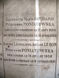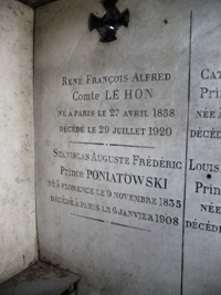 1931), fille que Françoise Mosselman avait eut en réalité du très fameux duc de Morny (elle inspira ce savoureux quatrain : Quel est donc ce visage blond / Qui ressemble à la reine Hortense ? / C’est la fille de Monsieur Le Hon / Morny soit qui mal y pense). Louise épousa le prince Stanislas PONIATOWSKI (1835-1907), membre de l’illustre famille dont fut issu le dernier roi de Pologne. Tous sont inhumés dans cette chapelle. Stanislas et Louise eurent plusieurs enfants, dont certains sont également inhumés ici. Ils furent en outre les bisaïeux de l’homme politique Michel Poniatowski (1922-2002), et les trisaïeux de Sarah Poniatowska, l’épouse du chanteur Marc Lavoine !