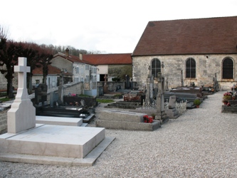 Le petit cimetière est encore autour de son église. Le long du mur et autour du calvaire,