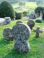 Du cimetière, la vue sur le paysage est magnifique (la Rhune à gauche, l’océan à droite). Ce lieu de repos possède un très grand nombre de pierres tombales discoïdales, dont certaines datent du XVIe siècle : on connaît mal la signification de celles-ci, malgré leur évidente symbolique chrétienne. Ces stèles étaient très certainement érigées à la mort d’une personne, mais sans qu’il n’y ait une sépulture évidente (il n’y a pas toujours un corps enterré). La symbolique est très riche, et représente les grandes forces de la nature (motifs solaires et végétaux).