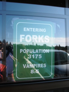 Evidemment, le village vit depuis plus d’un an à l’heure Twilight : on mange, on dort, on boit Twilight. Dès l’arrivée dans la bourgade, des panneaux indiquent la couleur ! On pénètre dans Forks par l’officine du shérif (il doit être constamment importuné dans la mesure où c’est le métier du père de l’héroïne). Devant l’office de tourisme, la Chevrolet rouge de la jeune fille (en fait, c’est « une » Chevrolet rouge, pas celle du film). L’office de tourisme propose évidemment des circuits « Twilight » : la maison de Bella (parmi d’autres maisons assez semblables), le lycée, l’hôpital ou travaille le père Cullen, et clou de la visite : la maison Cullen ! Alors là, les amateurs vont être déçu : si dans le film elle apparaît telle une propriété aux lignes modernes perdue au plus profond de la forêt, il s’agit en réalité d’un Bed & Breakfast en plein milieu de la ville. Magie du cinéma…