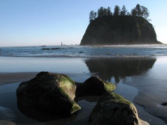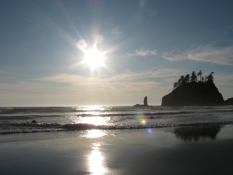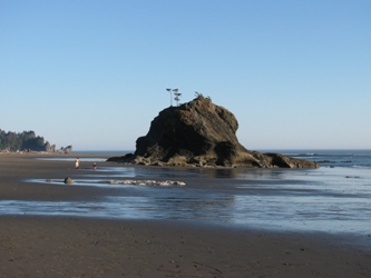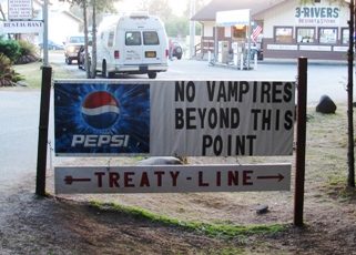 Prenons maintenant la direction de La Push… Evidemment, on traverse des paysages aperçus dans le film, en particularité la forêt. Arrivée à La Push, c’est rebelote : un panneau indique le plus sérieusement du monde la frontière entre le monde des vampires et celui des loups-garous. Une épicerie met à disposition, en tête de gondole, des gousses d’ail « arme anti-Cullen ». Bref, si vous êtes un vampire, vous n’êtes pas le bienvenu. La réalité rattrape pourtant le touriste : dans le film comme dans la vraie vie, La Push est une réserve indienne, celle des Quileutes. Et dans la vraie vie, les Indiens, c’est souvent pauvre. De fait, le village, bien plus petit que Forks, offre un paysage de quelques maisons souvent faméliques et de caravanes. A l’extérieur, les Indiens font invariablement sécher le poisson. Quelques maisons affichent des messages peu encourageants (du genre « go home »). On ne sait si c’est le fait d’avoir été catalogué comme des loups garous ou l’afflux de touristes qui les font réagir ainsi. Mais La Push a un atout : un littoral que je vous laisse découvrir, très photogénique, surtout le soir : sur la plage, des troncs rapportés par les flots sont venus mourir, réserve de bois flotté typique de l’état de Washington. Dans le roman et dans le film, La Push est la « base de loisirs » de la jeunesse oisive de Forks, qui vient y faire de la planche. On imagine qu’en cas de vent, ce doit être effectivement le sport national !