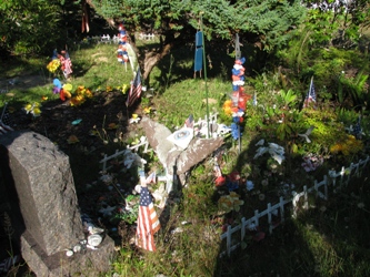 Beaucoup de militaires également, l’armée étant aux Etats-Unis un moyen d’ascension sociale pour des populations qui restent majoritairement marginalisées. L’acculturation des Quileutes, outre le drapeau, se singularise par le grand nombre de témoignages d’attachement au christianisme : les croix, mais aussi les chapelets déposés en grand nombre.