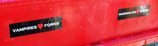 Deux villages forment l’épicentre de ce récit : Forks et La Push (on prononce « la pouche » : c’est plein de légèreté) ! La première est un bourg sans histoire, la seconde une réserve indienne en bord de mer, où les habitants font sécher le poisson. C’est là que ça se complique : si les vampires ont droit de cité à Forks, La Push leur est interdit en vertu d’un ancien traité car c’est là que vivent les Quileutes, les fameux indiens loups-garous ! Bref, on se demande encore comment les simples humains arrivent à survivre en étant en plus au courant de rien, les niais… Quand elle a choisit les lieux, Stephenie Meyer ne s’y était jamais rendu… Alors c’est dire que ces deux bleds, qui vivaient tranquillement au rythme de la crise et des expropriations, a senti le filon… Et c’est à ce voyage que je vous convie aujourd’hui, car figurez vous que je me suis promené dans ces contrées. A l’époque, je ne connaissais vaguement que l’affiche du film. Et c’est là, devant tant d’ironie devant ce « chef d’œuvre », que les amateurs inconditionnels de la saga vont me maudire : c’est là bas, à quelques kilomètres de la maison des Cullen, que j’ai vu le film… C’est vraiment donner de la confiture aux cochons !