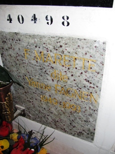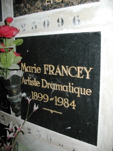 – Marie FRANCEY (1899-1984) : comédienne particulière puisque comédienne de doublage, son visage est inconnue mais pas sa voix. Elle fut la voix française de très nombreuses actrices américaines, en particulier celle de Bette Davis, mais aussi celle de la sorcière dans Blanche Neige et les sept nains et, plus près de nous, la voix de ET (et oui : ET téléphone maison, c’est elle !). Case 23 096.