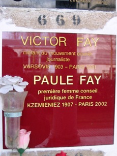 – Victor FAY (1903-1991) : militant de gauche et un homme politique franco-polonais, il quitta la Pologne pour s’installer en France en 1925. Militant en vue, il fut désigné de 1929 à 1933 par l’Internationale pour mettre en place et diriger les écoles de cadres du PCF et de la CGTU, où il eut entre autres comme élèves Jeannette Vermeersch, Waldeck Rochet, Jean-Pierre Timbaud. Resté marxiste mais ayant abandonné le stalinisme suite aux procès de Moscou, il adhéra à la SFIO dont il représenta l’aile la plus à gauche. Résistant dès 1940, il devint après la guerre rédacteur en chef de Combat auquel il donna un positionnement anticolonialiste et tiers-mondiste. Avec Michel Rocard, il fonda le PSU. Dans la même case fut inhumé l’urne de son épouse, Paule FAY (1907-2002), qui fut la première femme conseil juridique de France. Case 669.