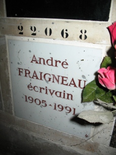– André FRAIGNEAU (1905-1991) : écrivain et éditeur français, il participa en 1941 à un groupe d’écrivains français qui se rendirent à la rencontre de Joseph Goebbels au Congrès de Weimar, aux côtés de Jacques Chardonne, Marcel Jouhandeau, Pierre Drieu La Rochelle, Robert Brasillach, Ramon Fernandez et Abel Bonnard. Cela lui valut, après 1944, d’être mis à l’index par le Comité national des écrivains. Après-guerre, il fut l’un des auteurs de prédilection des écrivains de la génération des hussards, dont plusieurs comme Michel Déon et Antoine Blondin le considérèrent comme un maître en littérature. Homosexuel, il repoussa les avances de Marguerite Yourcenar. Case 22 068.