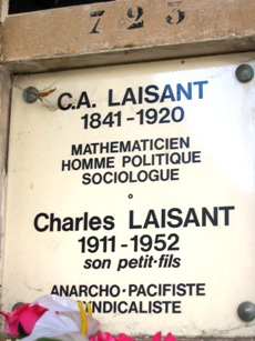 génie lorsqu’éclata la guerre de 1870, il assura durant le siège de Paris la défense du Fort d’Issy jusqu’en janvier 1871. Il se trouvait en garnison à Tours lorsque la Commune de Paris est proclamée, mais ses opinions avancées lui valurent d’être muté en Corse puis en Algérie. Il quitta ensuite la carrière militaire pour se consacrer à la politique : député de la Loire inférieure de 1876 à 1885, il siégea alors sur les rangs de l’extrême-gauche. En 1885, il fut élu député de la Seine, puis en 1889 à Paris sous l’étiquette Boulangiste. Déçu par l’échec du Boulangisme, il renonça ensuite à la politique pour se consacrer à l’enseignement. Parallèlement à son rôle important dans la vie publique, il publia de nombreux ouvrages scientifiques ; dirigea notamment la partie mathématique de la Grande encyclopédie et fonda une importante publication, Intermédiaire des mathématiciens. Il fut un des responsables de la "Ligue internationale pour l’éducation rationnelle de l’Enfance" fondée par Francisco Ferrer. Néo-malthusien, libre-penseur et franc-maçon, il se passionna pour l’espéranto. Il collabora à de nombreux journaux "La Bataille syndicaliste" , "l’Ecole rénovée", "l’Ecole émancipée", " l’Idée Libre", et écrivit également des brochures ou des essais théoriques comme "La barbarie moderne". Dans la même case se trouve l’urne de son petit-fils, Charles LAISANT (1911-1952), Militant pacifiste, anarcho-syndicaliste et anarchiste, qui collabora aux publications pacifistes "La Patrie Humaine", "l’Echo Pacifiste", "Le Huron". En 1936, il fit partie du Comité national du Front Populaire de la Jeunesse". Il adhéra ensuite à l’Union Anarchiste où il fut partisan d’une union des diverses organisations libertaires et anarcho-syndicaliste. Case 723.
