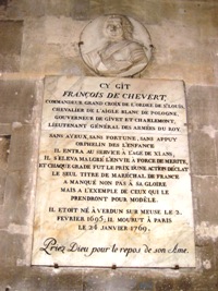 – à l’entrée de l’église, on voit sur le mur la plaque funéraire du général François de CHEVERT (1695-1769) qui était lieutenant colonel lors du siège de Prague par le comte de Saxe, en 1741, et c’est à lui que l’on doit la prise de cette place. L’année suivante, il défendit cette même place pendant 18 jours, avec 1800 hommes, contre toute l’armée autrichienne et ne capitula qu’aux conditions les plus honorables. L’épitaphe inscrite sur cette plaque est de Diderot.
