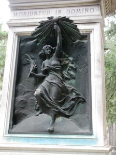 – Étonnante composition de la tombe Pascal, réalisé par une femme ayant perdu son époux et son jeune fils de 9 ans : un bas-relief, un prie-Dieu et un banc de prières recouvert d’un drapé !
