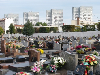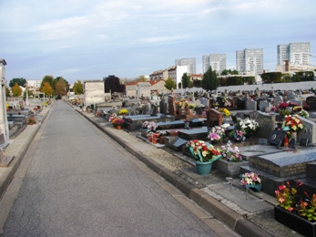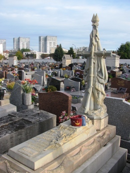 Le cimetière de Maisons-Alfort, dans un cadre désespérément plat et peu arboré, offre un paysage urbain caractéristique des cimetières banlieusards, où l’alignement horizontal des tombeaux et empilement vertical des immeubles se répondent.
