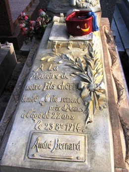 chef d’oeuvre du cimetière est un petit bijoux de précision ornementale : la tombe Berne-Bernard, qui rend hommage à André Bernard, tombé à 22 ans sur le front en 1914, présente un décor en céramique subtil composé de baïonnettes et fusils disposés en forme de croix et portant des drapeaux. Sont représentés également la musette, le bonnet d’un régiment de l’armée d’Afrique, un obus... L’ensemble fut réalisé par l’ entrepreneur Boussard et les céramistes Dugue et Theis, de Vitry-le-François.