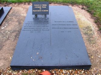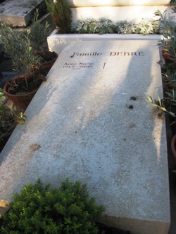 Robert s’était marié en première noce avec Jeanne DEBAT-PONSAN (1879-1929). Fille du peintre Edouard Debat-Ponsan (qui repose au cimetière de Passy), c’est-elle qui avait fait connaître la Touraine à la famille Debré : elle hérita de son père du château de Nazelles, où toute la famille vécut. Elle fut inhumée au cimetière de Nazelles-Négron (37). Sa stèle donne plusieurs indications : elle rend tout d’abord hommage « à la mémoire du peintre Edouard Bernard Debat-Ponsan (1847-1913), Prix de Rome qui habita le château de Nazelles de 1900 à 1913 ». Elle signale ensuite la présence de Jeanne, « première femme interne des hôpitaux de Paris ». Auprès d’elle repose sa sœur, Simone Debat-Ponsan (1886-1986), qui fut la seconde épouse du sénateur André Morizet (qui repose dans le même tombeau qu’Edouard Debat-Ponsan à Passy !). C’est enfin dans ce même tombeau de Nazelles que repose le second fils de Robert Debré et de Jeanne Debat-Ponsan, le peintre et illustrateur Olivier DEBRÉ (1920-1999).
