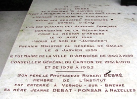 Il fut enterré dans la partie moderne du cimetière d’Amboise dont il avait été maire de 1966 à 1989. Il repose avec son épouse, Anne-Marie Lemaresquier (1912-2001), fille de l’architecte Charles Lemaresquier (qui repose à Sète). Dans ce tombeau se trouve également Maylis Ybarnegaray-Debré (1942-1988), l’épouse de François Debré, fils de Michel. L’épitaphe assez longue de ce tombeau précise le lieu d’inhumation de son père et de sa mère ! En septembre 2020, le journaliste et écrivain François DEBRÉ (1942-2020), lauréat du prix Albert-Londres en 1977, les y a rejoints.