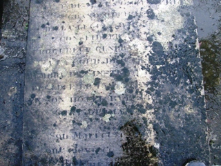 Il est à noter que la partie basse de la tombe a souffert d’infiltrations en eau : la plaque funéraire y est beaucoup plus fragile et plus friable. Dommage : à l’endroit du nom du cimetière où fut primitivement inhumée la comtesse, à la graphie peu lisible s’ajoute un éclat de la pierre. Du coup, supputations plutôt que véritable certitudes. Herbert lisait "Tours", nous en étions arrivé à "Trieste". Or, il semble n’y avoir aucun lien entre la défunte et ces deux villes. Le nom exact du cimetière restera à déterminer. J’y retournerai avec une petite brosse, car à ce niveau là, il faut y aller sur du velours si on ne veut pas abîmer la pierre.