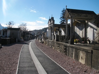 Dominé par les montagnes, le cimetière d’Embrun est à taille humaine malgré une superficie honorable : ici comme ailleurs dans les Hautes Alpes, les tombeaux familiaux prennent de la place. Tout comme celui de Gap, il est l’un des cimetières les plus "bavards" qu’il m’ait été donné de visiter : les professions des défunts sont le plus souvent indiquées, intéressante photographie socioprofessionnelle de la ville entre 1850 et 1950.