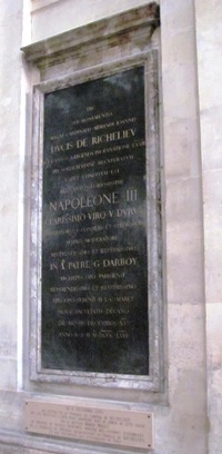 On sait moins que 27 membres de la famille des ducs de Richelieu ou de Fronsac reposèrent, à la suite du cardinal, dans l’église de la Sorbonne qui devint ainsi le Panthéon familial. Ceux qui y furent inhumés avant la Révolution connurent évidemment également les profanations de 1793, et ne sont donc plus ici que des souvenirs. Sous le vitrail aux armes du cardinal, une plaque rappelle la présence de sept membres de la dynastie dont les corps, post-révolutionnaires, se trouvent encore là ; à savoir les quatre derniers ducs [2] et certaines de leurs épouses. C’est en 1952 que fut inhumé le dernier d’entre-eux, Marie-Odet Jean Armand.