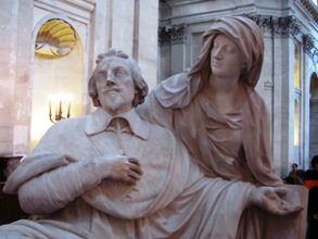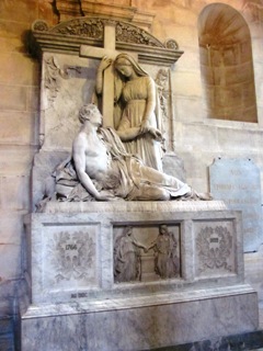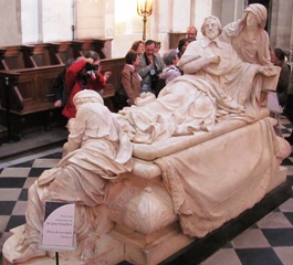 C’est dans le chœur que se trouve le tombeau du fameux Armand Jean du Plessis, cardinal-duc de RICHELIEU (1585-1642). Il est d’usage sur ce site de ne pas s’appesantir sur la biographie de personnalités aussi célèbres, dont Internet regorge de données : rappelons simplement qu’il fut un efficace et pragmatique ministre de Louis XIII, qui lui conserva sa confiance dans un contexte difficile ; et que c’est à lui que l’on dut l’édification progressive de l’absolutisme dont Louis XIV fut le bénéficiaire, au prix de la soumission de la noblesse, de certaines élites urbaines, et des protestants du royaume. A la mort du cardinal, la duchesse d’Aiguillon, sa nièce et héritière, prit en charge ses dernières volontés. Elle commanda un tombeau monumental à Girardon, qui ne fut achevé qu’en 1694, le corps de Richelieu étant déposé dans une crypte sous le cénotaphe.