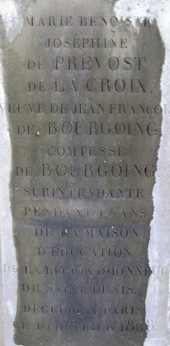 Joséphine PRÉVOST de La CROIX, Baronne de BOURGOING (1759-1838). Amie de Mme Récamier, c’est elle qui lui fit rencontrer Chateaubriand. L’une de ses filles épousa le maréchal Macdonald. Elle dirigea la maison de Saint-Denis de 1820 à 1837, et fut donc la première surintendante à reposer dans le cimetière. Sa tombe, l’une des plus anciennes du cimetière, est tout-à-fait identifiable.
