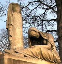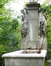 – La statue en pierre par Boverie sur la tombe Dubost est très abîmée et décapitée.