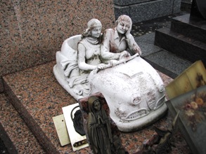 – Sur une tombe, une sculpture assez massive représente deux jeunes gens dans... une auto-tamponneuse !