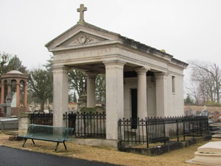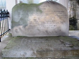 – L’architecte Eugène DUBREUIL (1782-1862) repose dans un tombeau composite qui mérite une description : il se remarque tout d’abord par l’imposante "chapelle Saint-Eugène" devant laquelle, outre la pierre tombale, se trouve un gros rocher sur lequel sont inscrits ses réalisations, ainsi qu’un tombeau bien plus ancien mais désormais illisible. Architecte du Roi, directeur des Bâtiments, Dubreuil participa, entre 1824 et 1848, à la réalisation de tous les grands chantiers royaux de la région : Palais et parc de Saint-Cloud, de Fontainebleau et de Meudon, manufacture de porcelaine de Sèvres, domaines du Vésinet...