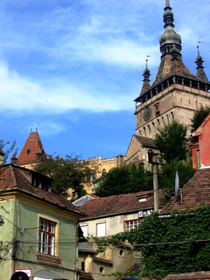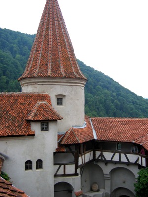 L’aspect extérieur du château, tout en tours sommées de toitures pointues et murs percés de barbacanes, demeure médiéval à souhait et dégage une impression de romantisme matiné d’un soupçon de fantastique. En revanche, l’intérieur a été réaménagé au début du 20ème siècle pour servir de résidence d’été à la reine Marie, nièce de la reine Victoria, lorsque le château lui fut offert par la ville de Brasov en 1920. Le contraste est flagrant : nous découvrons un charme à peine suranné en déambulant au gré des multiples terrasses, des passages à claire-voie et des salons coquets. Géographiquement, le château se dresse plusieurs centaines de kilomètres au sud de la région où devrait se situer celui du Dracula de Stoker. Cela n’a pas empêché les organisateurs d’aménager l’une des pièces en petit musée consacré au comte, avec notamment plusieurs éléments de costume ayant servi dans le film de Coppola, certificats d’authenticité à l’appui.
