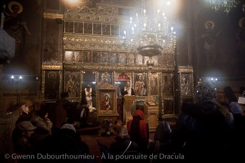 Après notre glorieuse et ultime enquête dans la ville de Galatz, nous filons donc vers l’ouest pour visiter ces deux monastères. Sur place, il ne fait nul doute que l’office du tourisme roumain a établi son choix entre les deux théories. A Snagov, où le gracieux monastère s’élève sur une petite île au beau milieu d’un vaste lac, c’est l’horreur absolue. Un tarif d’entrée hallucinant, une boutique de souvenirs au sein même du monastère, des panneaux explicatifs faisant le lien entre Vlad Dracula et le vampire de Bram Stoker jusqu’à une stèle déplacée en plein milieu du monastère alors que la logique voudrait qu’elle se trouve dans l’entrée ou éventuellement le long des murs. Nous assistons même à ce qui nous paraît une sévère engueulade à notre sujet entre l’un des moines, visiblement excédé par l’attrait touristique que représente son monastère, et le représentant de l’office de tourisme. Comme si ce n’était pas suffisant pour nous faire fuir, un vieux roumain exige de nous une taxe de parking en arguant que nous nous sommes garés devant chez lui…