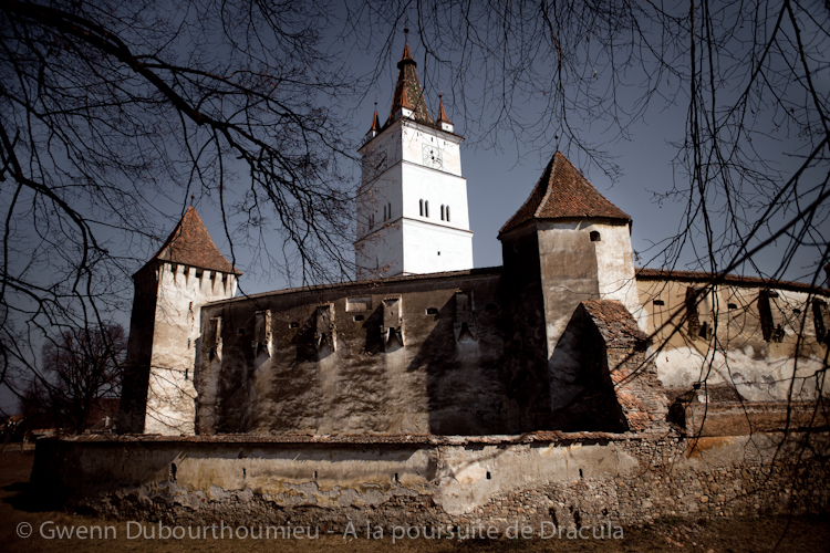 Après Sighisoara, superbe hameau médiéval accroché au sommet d’une colline biscornue, là où serait né Vlad Tépès, nous pénétrons dans une région dont le lourd passé conflictuel transparaît au détour de nombreux édifices, notamment les églises fortifiées qui fleurissent dans chacun des petits villages que nous traversons. Ainsi Biertan ou encore Médias, où l’église est cernée d’un rempart impressionnant brisé de cinq larges tours dont la plus haute aurait servi, selon une légende locale, de prison à Vlad Dracula ; peut-être après son arrestation par Mathias Corvin ? Ces petits bastions étaient destinés à accueillir la population du village en cas d’attaque, et nous en découvrons le plus bel exemple à Prejmer. Autour de la vaste église, une multitude de petits appartements s’adossent aux remparts déjà épais de plusieurs mètres. Il s’agit de cages à lapins d’une dizaine de mètres carrés censées pouvoir abriter chacune une famille. En tout, j’en dénombre près de trois cents, reliées par un système d’escaliers et de passages à claire-voie dignes d’un Escher particulièrement inspiré.