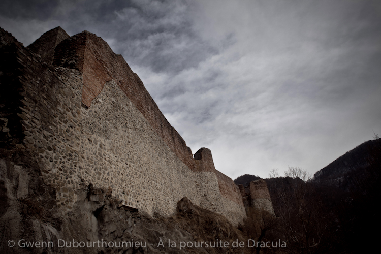 Par citadelle, il faut entendre lieu de refuge inextricable, et cela relève encore de l’euphémisme. De fait, il s’agit d’un petit bastion perché au cœur des Carpates : une tour et une centaine de mètres de rempart protégeant les quelques pièces nécessaires pour s’y réfugier. L’hypothèse qu’il s’agisse de la demeure du voïévode est bien éloignée de la réalité car, de fait, Vlad Tépès passa plus de temps dans des maisons citadines que dans des châteaux, et surtout pas celui-ci, esseulé sur son promontoire au beau milieu des montagnes. D’ailleurs, ici ne vécurent réellement que la demi-douzaine de soldats assignée à sa garnison. Abandonnant la Dacia sur le bord de cette route perdue, nous gravissons les 1480 marches qui mènent à cette citadelle accrochée comme par magie à son morceau de rocher pour dominer les deux vallées qui s’étendent de part et d’autre et ainsi assurer la garde de la frontière entre la Valachie et la Transylvanie. En contemplant ces ruines et leur improbable position, tandis que je reprends mon souffle, j’ai une pensée pour ceux qui la rebâtirent : les boyards (la version médiévale d’un riche propriétaire terrien, un terme encore utilisé aujourd’hui dans les campagnes roumaines) de Brasov que Vlad Tépès réduisit en esclavage et fit travailler à la reconstruction de l’endroit jusqu’à ce que mort s’ensuive.