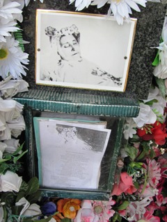 Surmontée d’un baldaquin,les innombrables fleurs qui montent le long des piliers lui créent un toit de verdure et de couleur. A un rosier grimpant se mêlent des gerbes de fleurs artificielles, à ses pieds sont posées des jardinières de fleurs.Des grappes de plaques de marbre portant, en lettres d’or, des remerciements pour des grâces obtenues : ex-voto le plus souvent réduits à un « merci » parfois suivi d’un prénom ou d’une initiale. Enfouie sous la végétation, inaccessible au regard, une plaque de pierre indique enfin qu’il s’agit de la dernière demeure d’Hélène Soutade, dite SAINTE-HÉLÉNA (1837-1885). Une sainte qui n’a rien d’officiel : l’archevêché refuse de se prononcer sur son cas et ne veut même pas en entendre parler. Il s’agit là de ce qu’il est convenu d’appeler une « canonisation populaire ». Ce qui est plus étonnant, c’est qu’on ne sait rien de sa biographie, mais son acte de décès indique qu’elle était institutrice. Elle serait devenue religieuse à l’âge de 42 ans. Sa « sainteté » serait attestée par deux miracles. Son culte prend la forme de pèlerinages sur son tombeau et de contact avec sa relique (une pièce de vêtement) accroché à la tombe. "Patronne des enfants" en raison de sa profession d’institutrice, sainte Héléna est régulièrement appelée à l’aide, notamment par des parents inquiets (études, maladie…)...